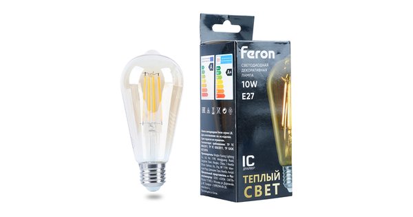 Лампа светодиодная филамент FERON LB-64, ST64 (декор. колба), 10W 175-265V E27 2700К (белый теплый), рассеиватель прозрачный золотой, 1200Lm, угол рас..