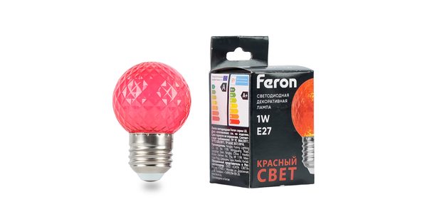 Лампа светодиодная FERON LB-385, G45 (шар), 1W 230V E27 (красный), рассеиватель прозрачный красный, угол рассеивания 270°, корпус пластик, 68*45мм..