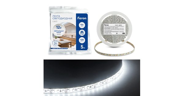Лента светодиодная 12V FERON LS613, 120*SMD2835, 9,6W/m, IP65, 4000К (нейтральный белый), Кратность резки мм 25 мм, 5000 *8*1,84мм..