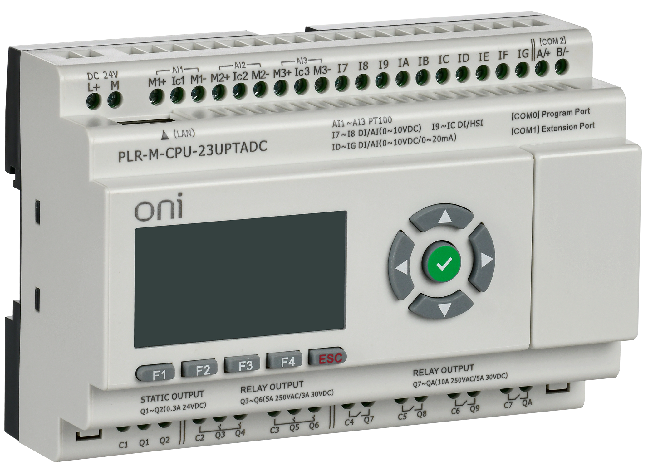 Микро ПЛК ONI. Расширяемая версия. Со встроенным экраном. 10 входов (4 как 0...20 мА или 0...10 В DC, 2 как 0-10 В, 4 DI, 2 из которых до 60 кГц), 3 т..