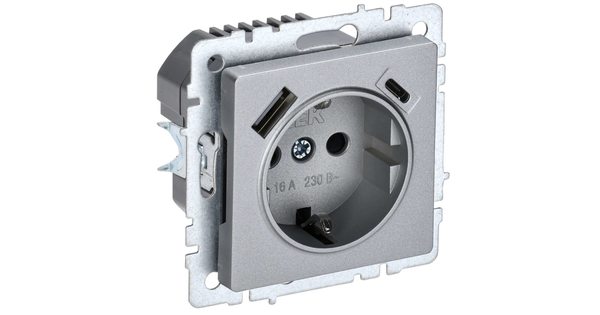 Розетка с заземлением, с защитными шторками для скрытого монтажа Inspiria, цвет "Алюминий", максимальный ток 16А, напряжение ~250В, максимальная мощно..