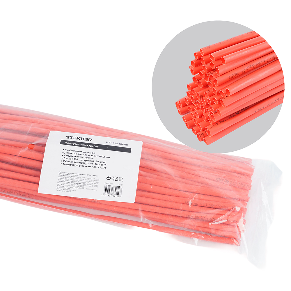 Термоусадочные трубки STEKKER HST-525-100RD, длина 1000мм. 50шт. в наборе, цвет: красный. Коэффициент усадки 2:1, диапазон рабочих температур -10..+3..