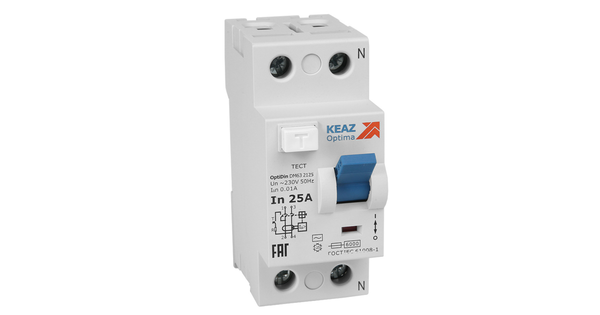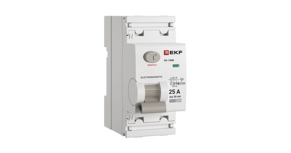 2 полюсное устройство защитного отключения на номинальный ток 25 А, номинальный отключающий дифференциальный ток 100 мА и рабочее напряжение переменно..