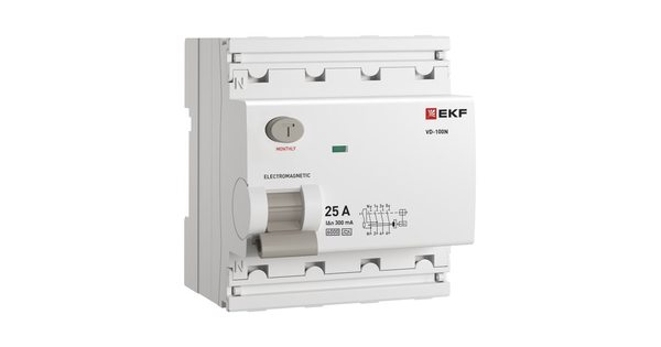 Четырехполюсное устройство защитного отключения на номинальный ток 25 А, номинальный отключающий дифференциальный ток 100 мА и рабочее напряжение пере..