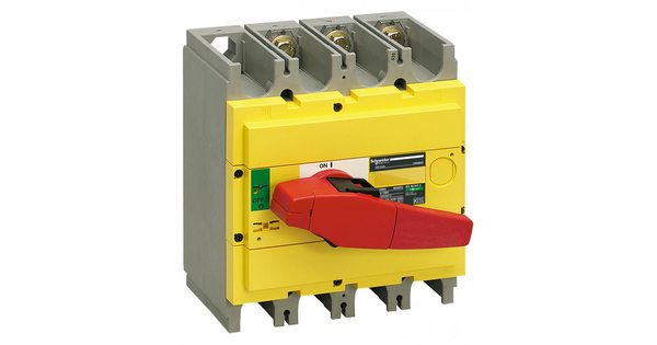 Выключатель-разъединитель серии Compact INS Schneider Electric, 3-полюсный; номинальный ток 500 А; тип управления Красно-желтая поворотная рукоятка; и..