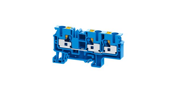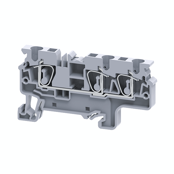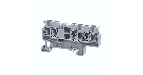 Клемма проходная типа push-in с тремя выводами на номинальное сечение проводника 10 кв. мм. Предназначена для установки в распределительных шкафах и щ..